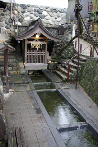 一度来た道を戻ることになりますが、商店が立ち並ぶ新町を歩きます。名前の通り、こちらが新市街ということなのでしょうが、心の奥底に残っているレトロな空気を感じます。コンビニやファーストフードのお店はありません。小ぢんまりとした個人経営と思われるお店がひっそりと軒を連ねています。この通りにぶつかる一本の小みちが「やなか水のこみち」です。小さな神社まで続く石畳の参道が、しっとりと雨に濡れています。わずか30メートルほどでしょうか。しかし、この趣あふれる小道、心惹かれるものがあります。私だけではないのでしょう。水路脇には、この雨にも関わらずスケッチをする人と、そしてカップルが身を寄せ合い相合傘で、記念撮影をしています。私もカメラのシャッターを何枚か切った後、心でもシャッターを切り、印象へと刻みました。