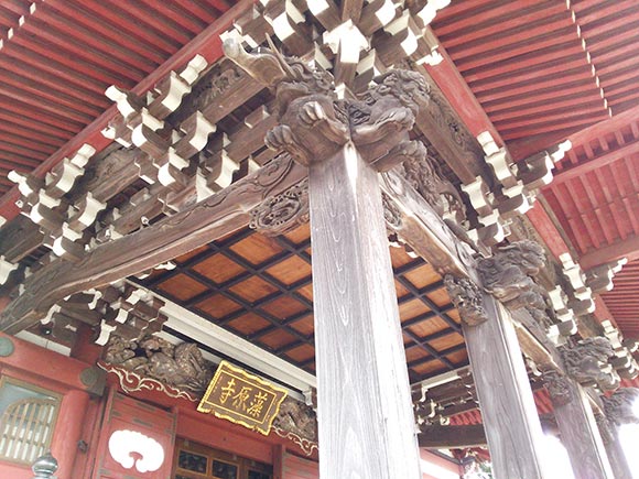 寺院の唐門破風では、房総で有名な彫刻師「波の伊八」二代目による、躍動感のある彫刻を見ることが出来ます。
