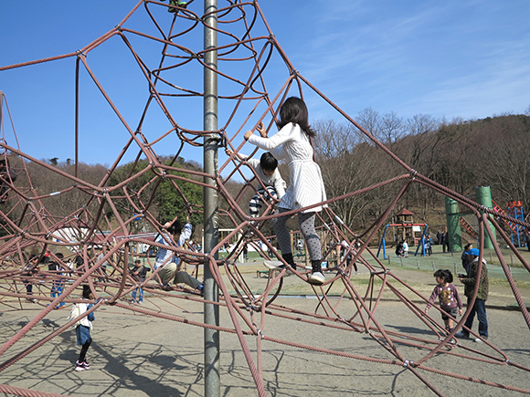 まず向かったのは、入口を入ってすぐにある「ダイナミック広場」。広々とした芝生の広場の奥には、こどもが大好きな遊具がなんと約25種類もあるんです!