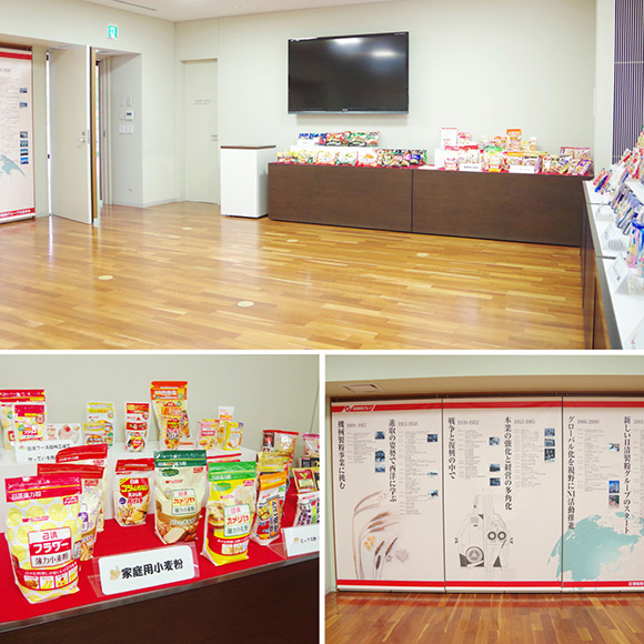 まずご紹介するのは、受付脇にある「プレゼンテーションルーム」。日清製粉グループのあゆみや商品がずらりと展示されています。