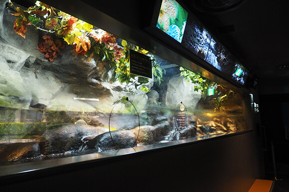 さらに奥に進むと、30分間で水量が変化する「川魚のジャンプ水槽」という水槽があります。