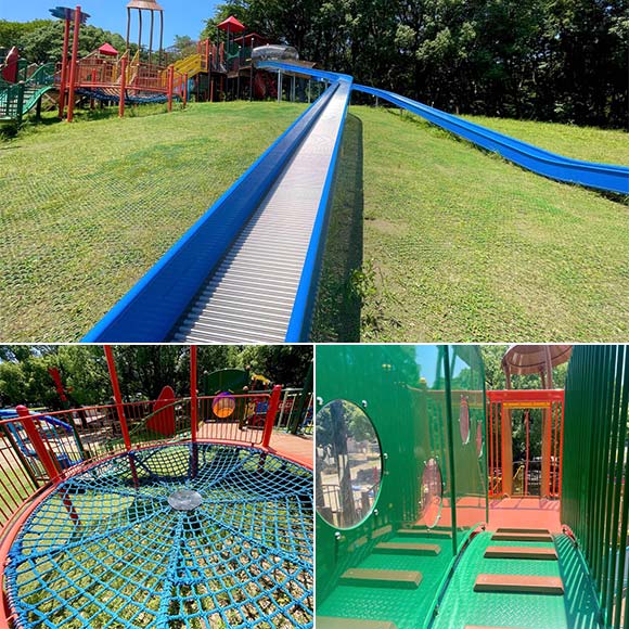 一際目を引くのが、丘の高低差を活かした大きな複合遊具!全長約24mのローラー滑り台をはじめ、トンネル状の滑り台やネットフロアーなど、さまざまな仕掛けがあり、飽きることなく楽しめます。
