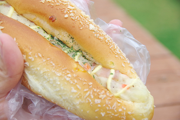 マッシュポテトと厚切りベーコンを挟んだコッペパン「ベーコンポテト」(160円)をいただきます。なめらかなポテトと香ばしいベーコンの相性は言わずもがな!ペロリと食べてしまいました!