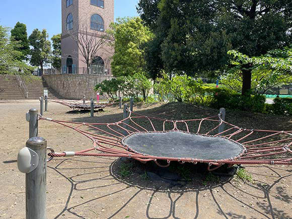 広場には、靴をはいたまま遊ぶトランポリンも!本格的なトランポリンが無料で気軽に遊べるのは、うれしいですね。