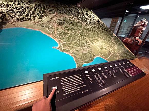 鎌倉地域のジオラマは、ボタンを押すと音声ガイドが流れます