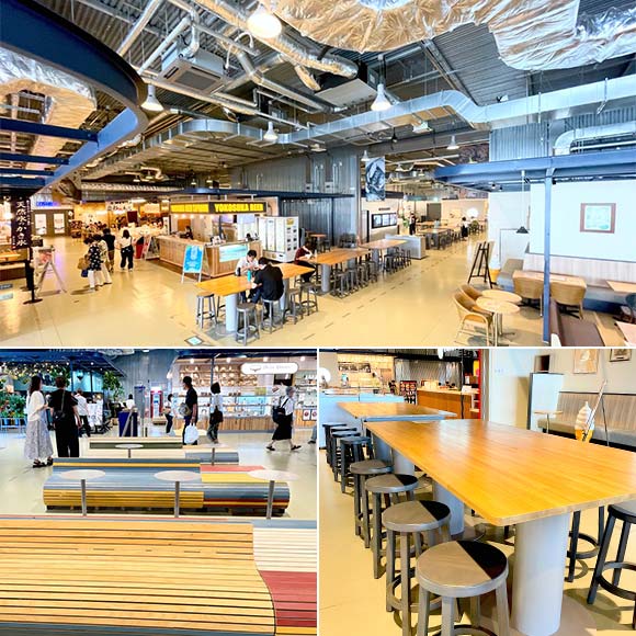 各所に設置されたテーブルやイスを利用して、お店で購入したものを食べられるのが特長です。
