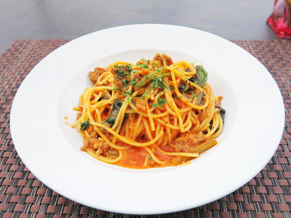 今日は「もち豚のソーセージと小松菜のトマトソーススパゲティ」をチョイス。