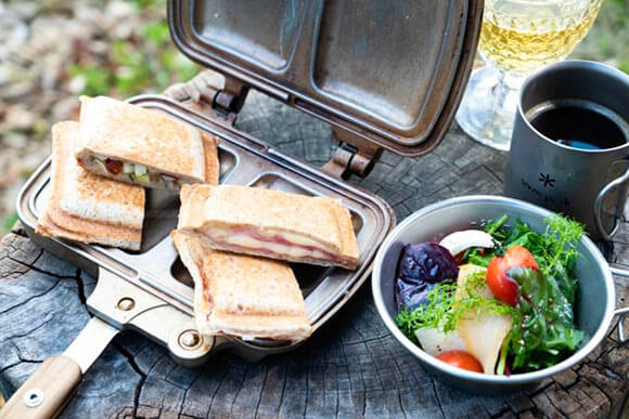朝食には、スノーピークのギアを使用してホットサンド作りを体験!焼き方はスタッフさんに教えていただけるので、普段料理をしない方でも安心です。