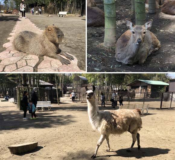 自然豊かな広場にシカやラマ、カピバラやウサギなどが放し飼いされていて、動物にご飯をあげたり、さわったりできるんです!