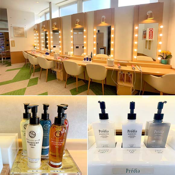 パウダールームは男性6カ所/女性20カ所あります。男性・女性ともに、化粧水・乳液・ボディローションなどが常備されていて、自由に使用することができます!