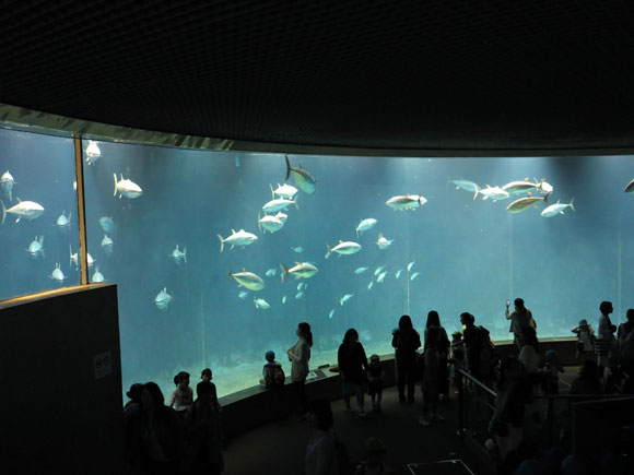 巨大な水槽の中には、クロマグロやハガツオなど回遊魚が群れで泳いでいます。一時期、水槽からマグロがほとんどいなくなってしまったこともありますが、今は復活していますのでご安心を!