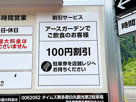 なお、こちらの駐車場から歩いてすぐの場所にあるレストラン「アースガーデン」を利用すると、駐車料金が割引になりますよ!