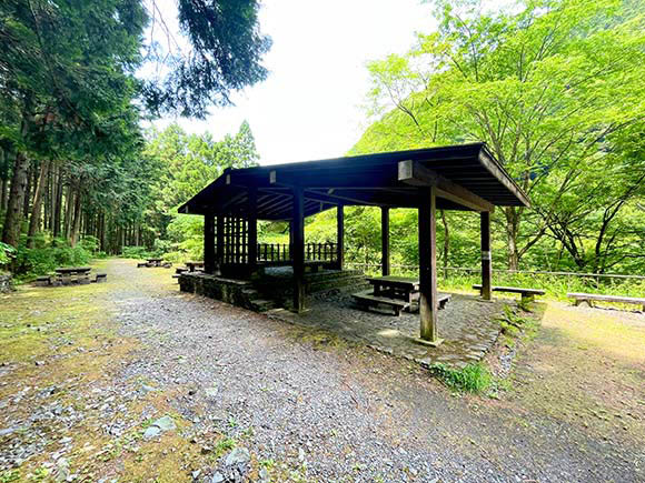 白丸ダムを後にし、5分ほど遊歩道を進むと見えてくるのが趣きある東屋。テーブルやベンチが設置されていて、こちらでお弁当を食べることもできます。
