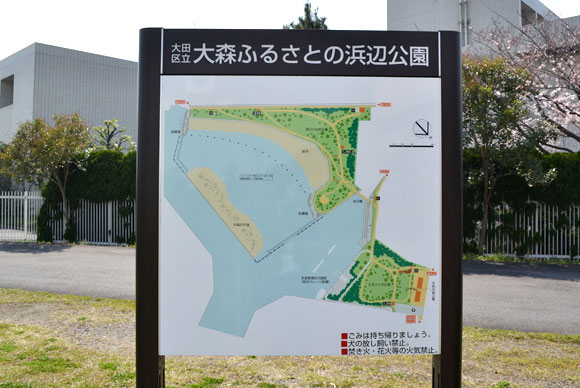 海苔のふるさと館は大森ふるさとの浜辺公園内にありますのでまずは公園をご紹介します。公園案内看板で全体像を把握します。案内図にある広い大きな砂浜に行ってみましょう。