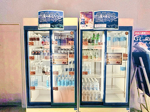岩盤浴やサウナには水分補給が欠かせませんが、1階ロビーでは世界各国約20種類の水が販売されています。硬度や成分もさまざまなので、お好みの1本を探してみてくださいね!