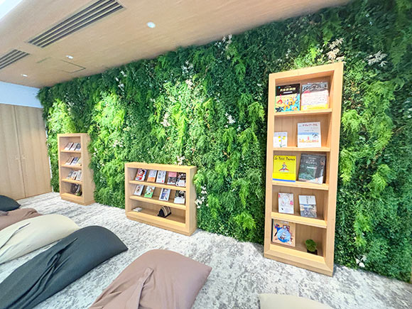 一面グリーンで飾られた壁際には、新聞・雑誌・絵本などが並ぶ本棚も。気になる本があれば、自由に手にとってみてくださいね!
