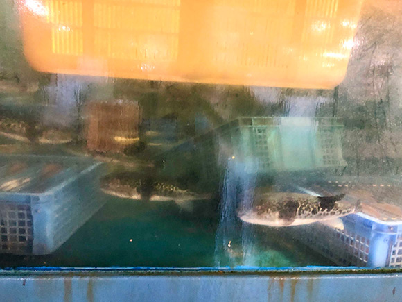 水槽の中で、魚が元気に泳ぐ様子は、まるで水族館!この日はふぐが泳いでいましたが、魚は時期によって変わるそう。どんな魚が見られるか楽しみですね!