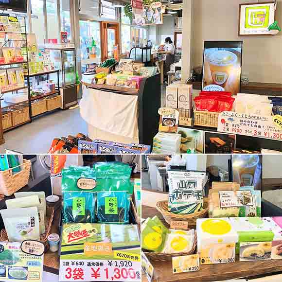 店内では、小野茶をはじめとするお茶商品や地元の特産品の販売も